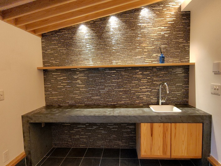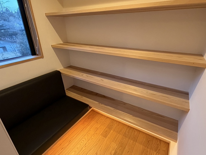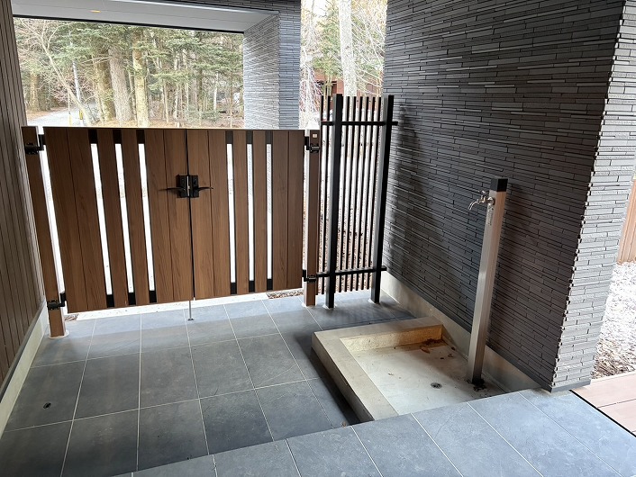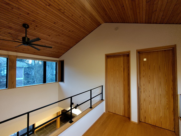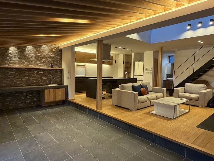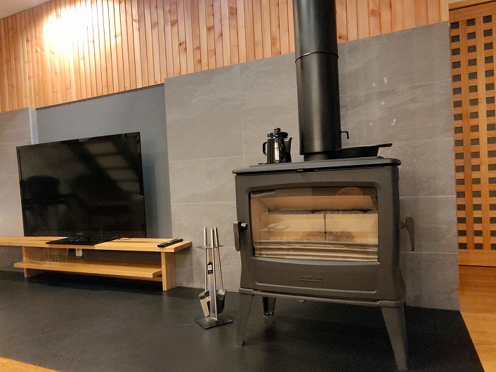 1階は土間ラウンジまで床暖房を備え、薪ストーブとともに四季を通して快適に過ごせます。